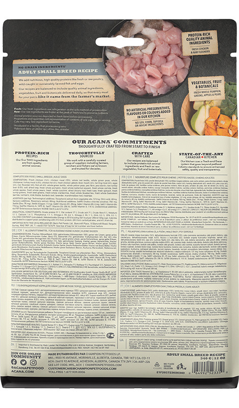 ACANA HERITAGE Adult Small Breed zawiera pełnowartościowe białko zwierzęce: kurczaka z chowu bezklatkowego oraz flądrę poławianą w naturalnym środowisku. Składniki te dostarczane są do naszej kuchni ŚWIEŻE w proporcjach diety WholePrey.