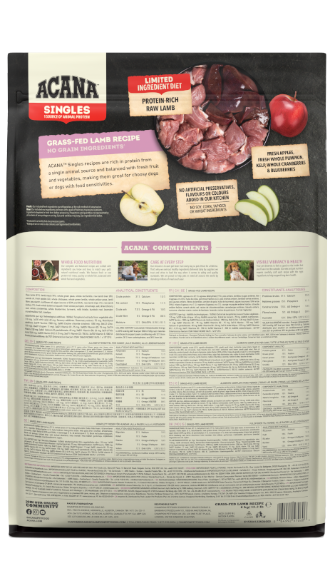ACANA SINGLES Grass-Fed Lamb to karma monobiałkowa, która zawiera 50% jagnięciny, będącej źródłem łatwo przyswajalnego białka zwierzęcego. Idealne rozwiązanie dla psów wrażliwych wszystkich ras, w każdym wieku.