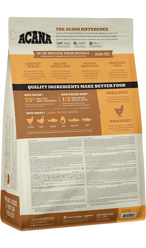 Koty wymagają diety bogatej w białko pochodzenia zwierzęcego. Taką potrzebę określa ich fizjologiczna budowa i drapieżna natura. Zainspirowana rozległymi, kanadyjskimi preriami i dziewiczymi jeziorami, ACANA Wild Prairie oferuje Twojemu kotu wysokiej jakości składniki zwierzęce, takie jak kurczak i indyk chowane na wolnym wybiegu, ryby słodkowodne i jaja z chowu ściółkowego. Dzięki temu ACANA jest bogata w białko i składniki odżywcze pochodzące z mięsa mięśniowego, narządów wewnętrznych oraz chrząstek i kości obecnych w proporcjach WholePrey w naszym jedzeniu. To sprawia, że Twój kot otrzymuje wszystko, czego potrzebuje do osiągnięcia pełni zdrowia.