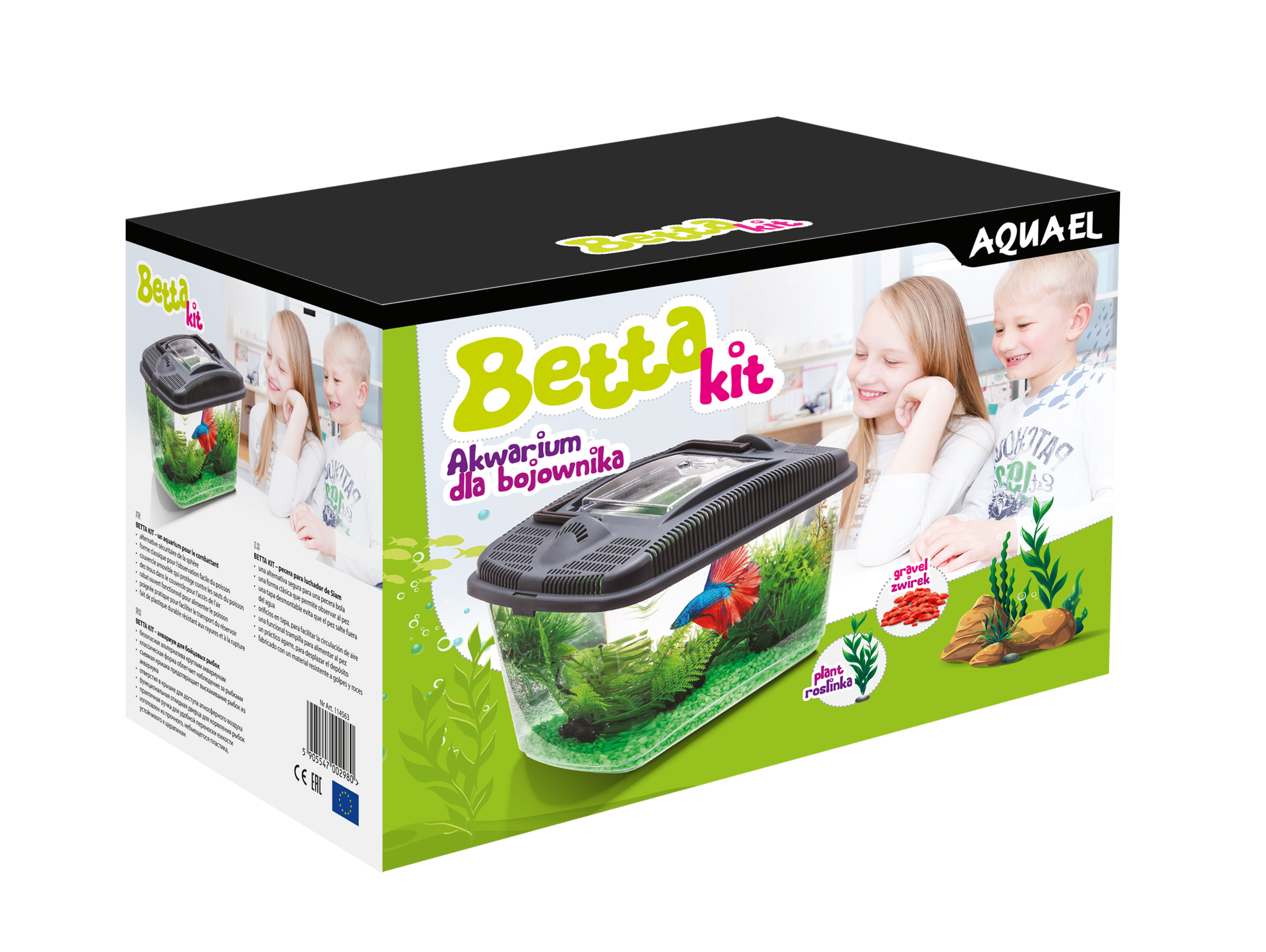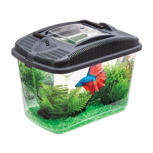 Akwarium dla bojownika, bezpieczna alternatywa kuli, klasyczny kształt ułatwiający obserwację ryby. Zdejmowana pokrywa chroniąca przed wyskoczeniem ryby, otwory w pokrywie dla dostępu powietrza atmosferycznego. Funkcjonalna, otwierana klapka do karmienia ryby, praktyczny uchwyt ułatwiający przenoszenie akwaria.