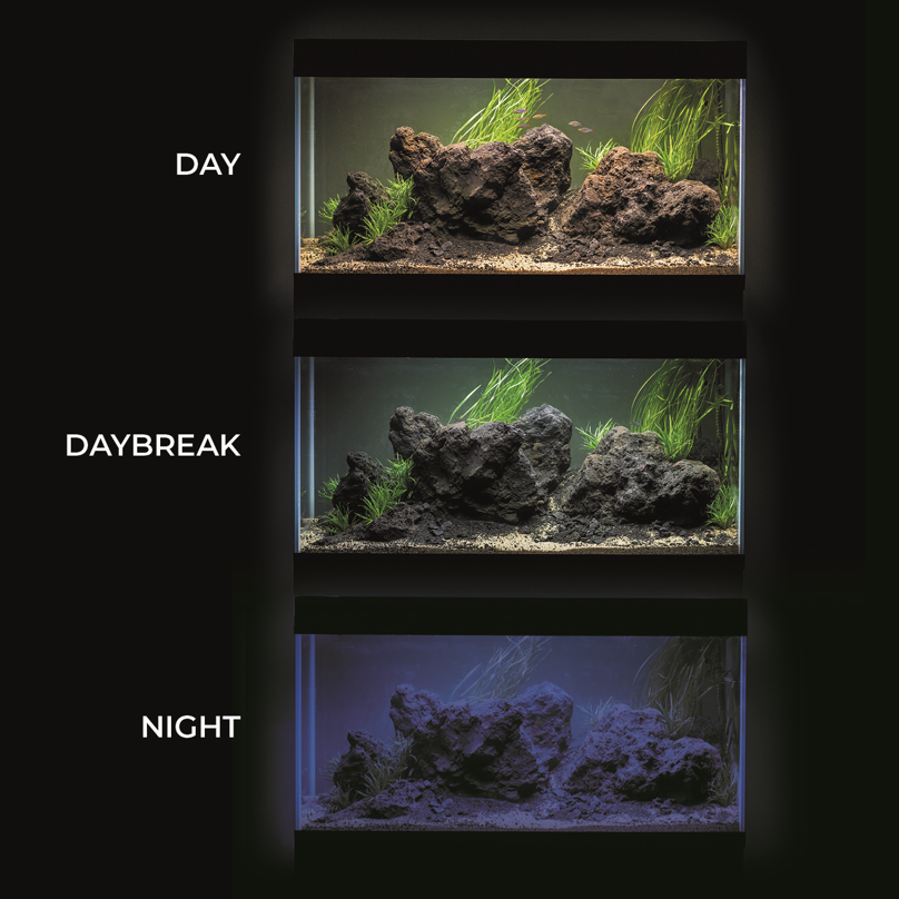 Działa w trzech trybach pracy: DAY / DAYBREAK / NIGHT. DAY to podstawowe i najmocniejsze światło, do oświetlania akwarium w ciągu dnia. DAYBREAK to obniżona moc oświetlenia dziennego do 50% plus światło niebieskie. Sprawdza się jako pierwszy tryb po nocy oraz podczas karmienia ryb – szczególnie w przypadku posiadania płochliwej obsady. NIGHT to niebieska poświata pozwalająca na unikalną obserwację akwarium po zmroku, w tym ryb i zwierząt o nocnym trybie życia.