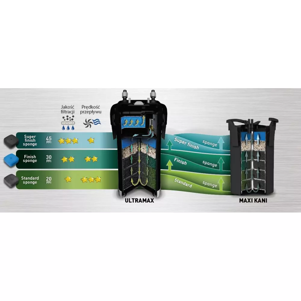 Gąbka SUPER FINISH o dużej gęstości (45PPI) to najdrobniejsza z gąbek dostępnych do filtrów Aquael. Zapewnia bardzo dobrą filtrację mechaniczną i biologiczną wyłapując nawet najdrobniejsze zanieczyszczenia. Pasuje do wszystkich filtrów Aquael serii Ultramax i Maxi Kani.