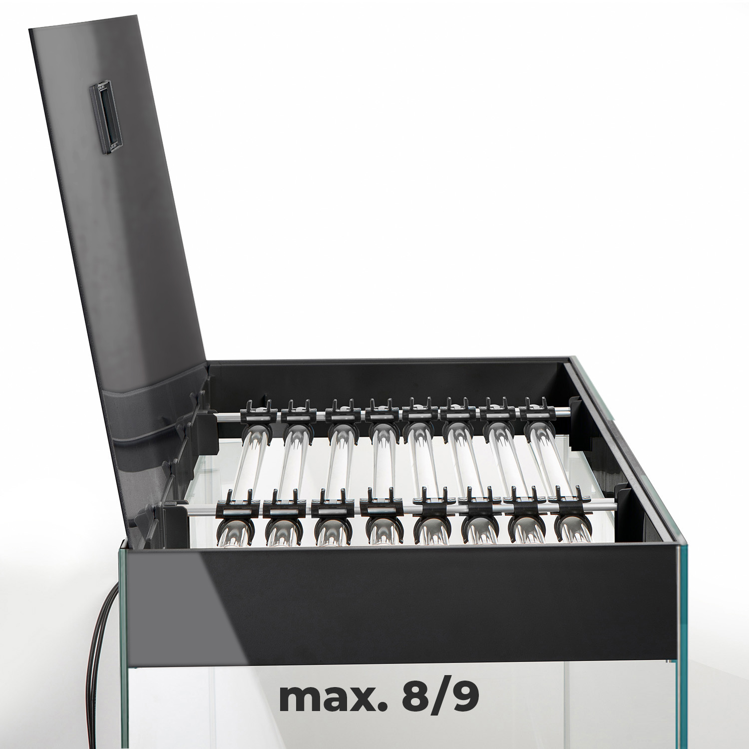 Pokrywy zestawów GLOSSY zawierają nowoczesne oświetlenie LED, które zapewnia prawidłowy rozwój roślin. W tylnej części pokrywy znajdują się specjalne otwory montażowe. Pozwalają one na swobodne zainstalowanie dowolnego filtra kanistrowego i innych urządzeń akwarystycznych.