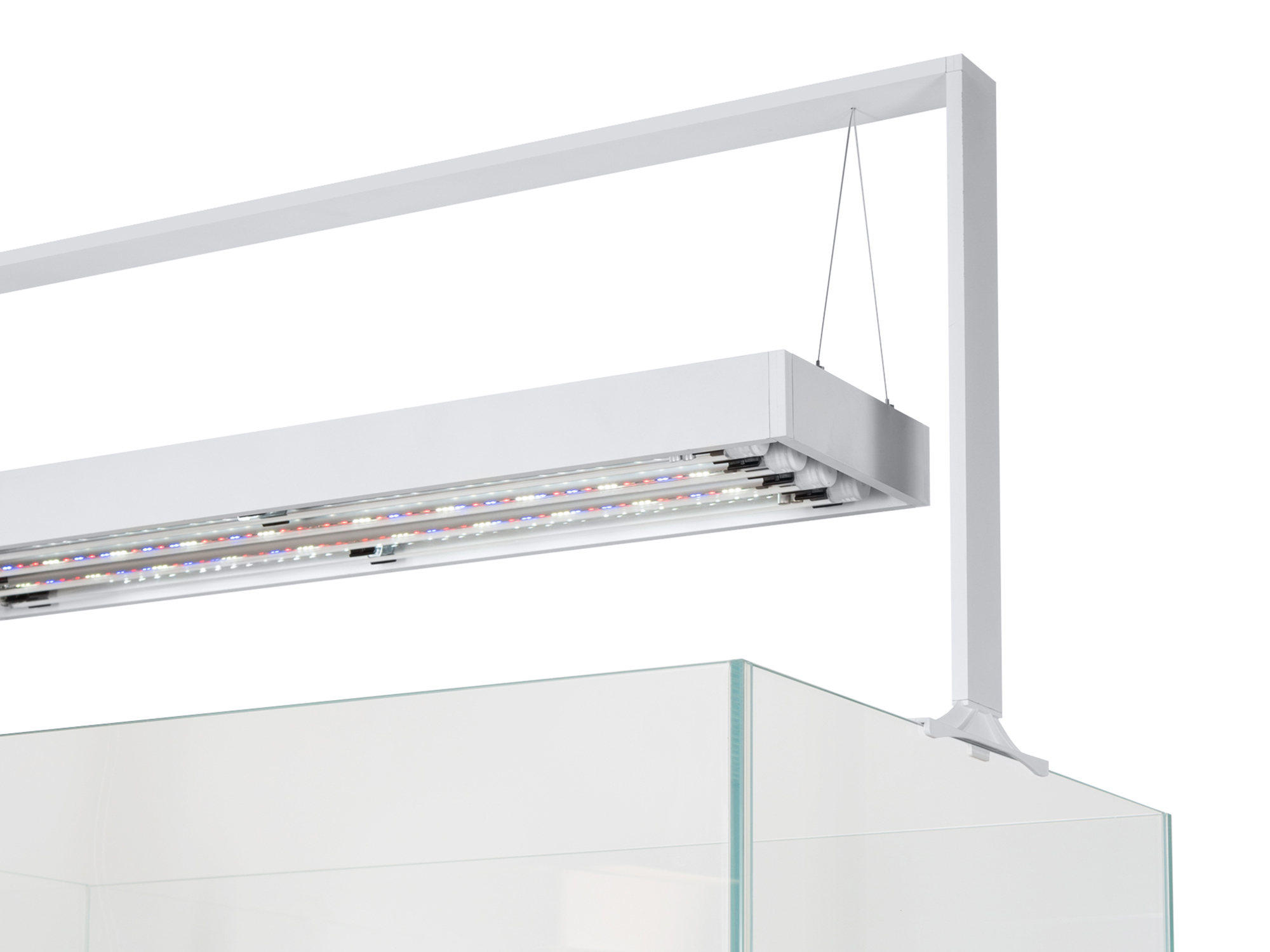 W skład zestawów wchodzi również elegancka dedykowana lampa wyposażona w wymienne moduły oświetleniowe Leddy Tube. Jedną z jej zalet jest możliwość wymiany pojedynczych elementów, a nie całej lampy. Lampa została umieszczona na estetycznym stelażu z regulowaną wysokością. Dodając owijkę na okablowanie, zadbaliśmy o to, by wygląd zestawu był dopracowany w każdym detalu. W zestawie znajduje się także mata pod akwarium.
