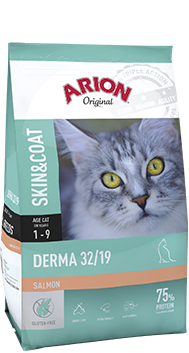 Karma Arion Original Cat Derma zawiera podwyższony poziom niezbędnych nienasyconych kwasów tłuszczowych Omega-3, co w połączeniu z łatwo przyswajalnymi minerałami w formie schelatowanej i witaminami pomaga zadbać o zdrową skórę i lśniącą sierść.
