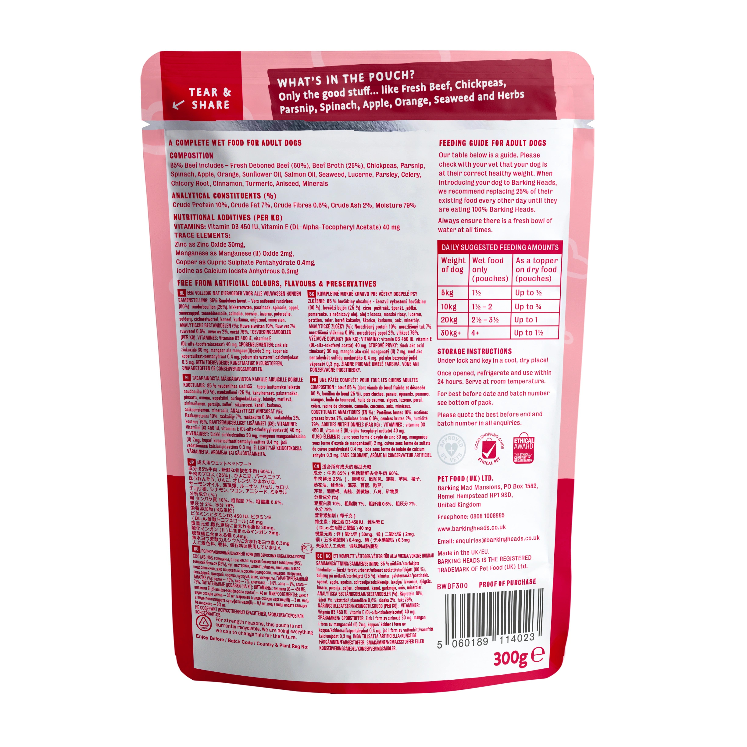 Barking Heads Beef Waggington składa się z mieszanki wołowiny, warzyw i ziół. Tradycyjna brytyjska receptura, w której świeże, starannie wybrane składniki gotowane są powoli i w dokładnie wyważonych proporcjach, co gwarantuje jakość i niepowtarzalny smak. Zdrowa karma dla psów dorosłych wszystkich ras z mięsem, warzywami i ziołami, wzbogacona o witaminy i minerały, nie zawiera zbóż. Wspaniały psi obiad bez sztucznych aromatów, barwników i konserwantów, który dostarczy ​​wszystkich ważnych dla jego zdrowia substancji.
