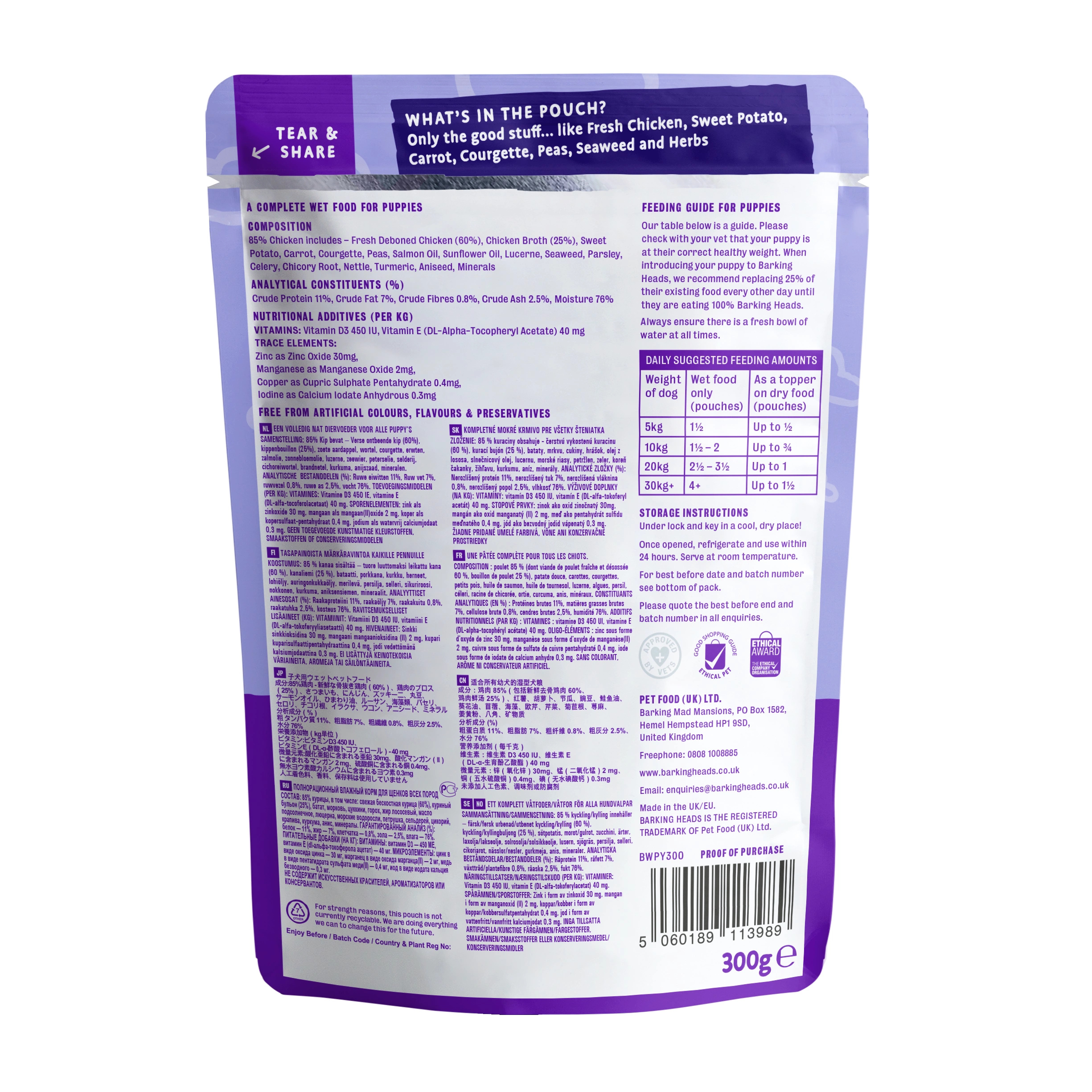Barking Heads Puppy Days został specjalnie opracowany dla wszystkich potrzeb rosnącego szczeniaka. To pyszna, bezzbożowa karma z dodatkiem witamin i minerałów, została przygotowana z wyłącznie najlepszej jakości naturalnych składników. To pełnowartościowa karma dla szczeniąt, bogata w białko (85% kurczaka z wolnego wybiegu), zmieszana z warzywami i ziołami dla najnowszego członka rodziny.