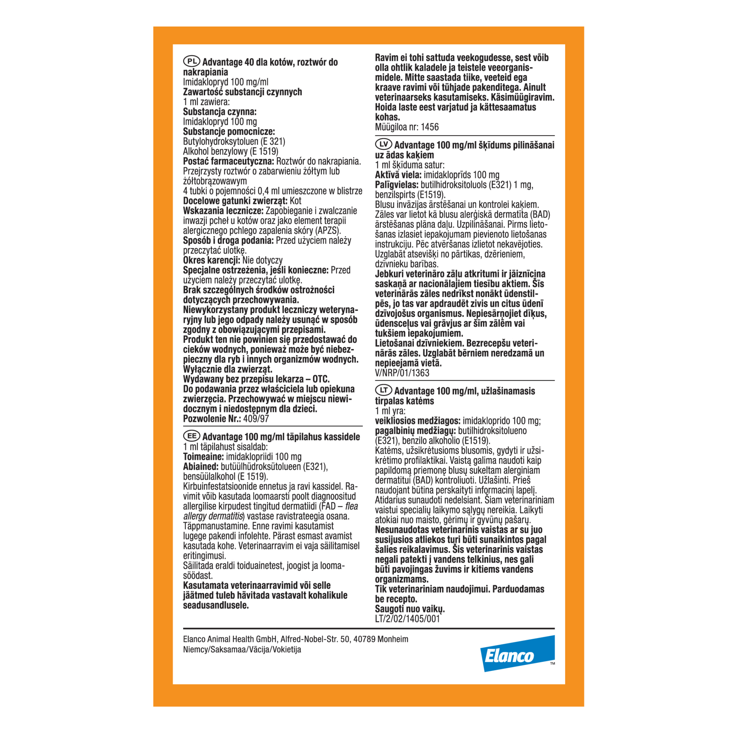 Bayer Advantage Roztwór Do Nakrapiania Dla Kotów 4×0,4ml – Dane Techniczne