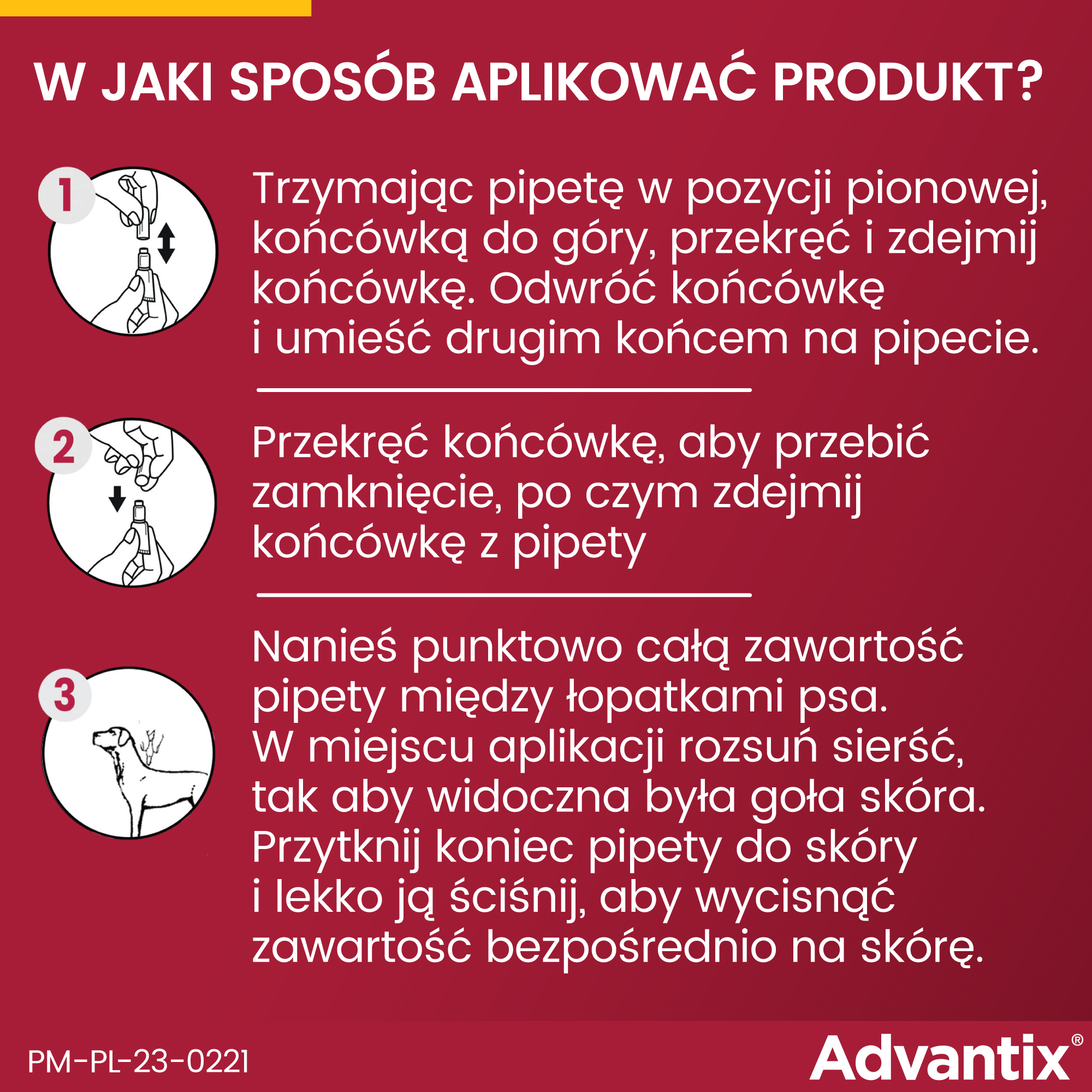 - Zawartość pipety należy zakroplić na skórę psa od łopatek do nasady ogona