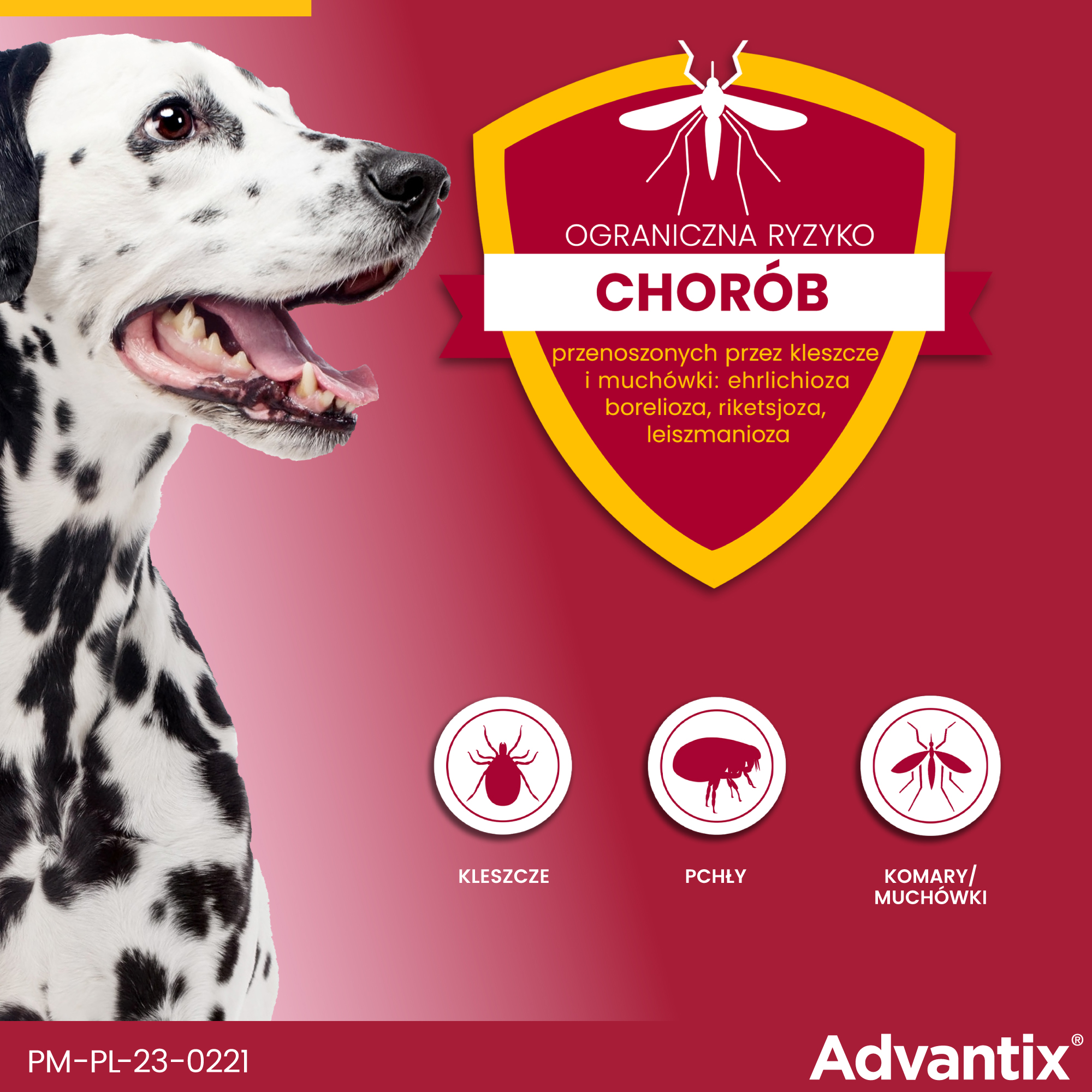 Bayer Advantix to preparat ochronny w kroplach dla psów powyżej 7 tygodnia życia i ras od 10 do 25kg, eliminujący kleszcze, pchły, wszy, wszoły.