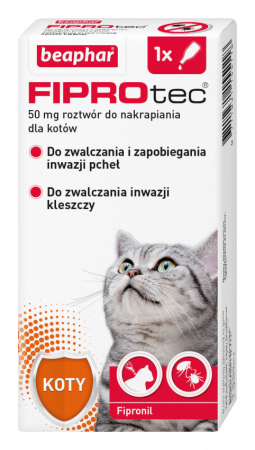 Krople spot-on zawierające fipronil. Doskonała ochrona dla kotów przed groźnymi ektopasożytami takimi jak pchły i kleszcze. Wyjątkowo łatwa aplikacja zapewniająca długotrwałą ochronę. Substancja czynna bezpieczna dla zwierząt i ludzi. FIPROtec bardzo dobrze sprawdza się u zwierząt uwielbiających letnie zabawy w wodzie i u zwierząt wymagających regularnych kąpieli gdyż jego substancja czynna, którą jest fipronil, nie rozpuszcza się w wodzie.