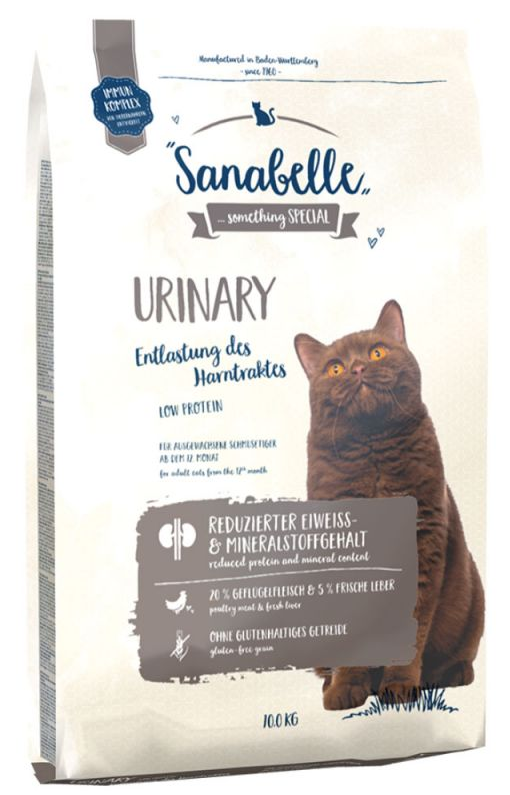 BOSCH Sanabelle Urinary to sucha karma dla kotów z problemami dróg moczowych. Jest to kompletne pożywienie dla wszystkich kotów od 12 miesiaca życia. Formuła opiera się na obniżonej wartości białka, co odciąża nerki. Jednocześnie wysoki poziom tłuszczu gwarantuje dostarczenie niezbędnej do zabaw energii. Do stosowania profilaktycznie przeciw kamieniom struwitowym i szczawianowym.