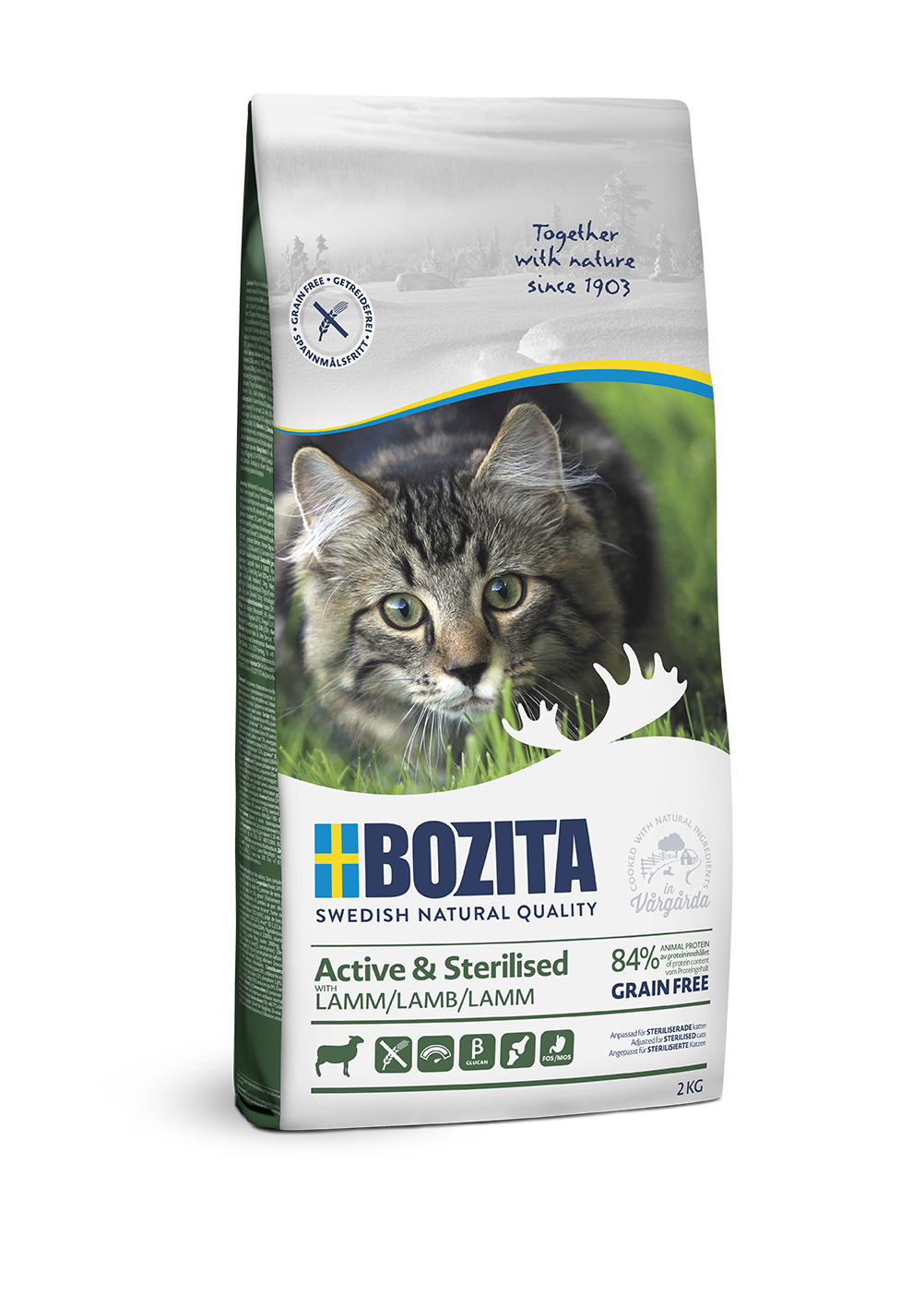 Bozita Active & Sterilised z jagnięciną bez dodatku zbóż to pełnoporcjowa karma dla dorosłych kotów o wyższym poziomie aktywności i wysterylizowanych. Wyższa zawartość energii jest szczególnie odpowiednia dla aktywnego kota a świeżo przyrządzona jagnięcina nadaje się nawet dla najbardziej wybrednych kotów. Aktywny fizycznie kot wymaga więcej od swojego ciała, dlatego też nasza karma zawiera naturalne beta-glukany drożdżowe o właściwościach prozdrowotnych, jak również siarczan chondroityny oraz glukozaminę, czyli naturalne budulce zdrowych stawów.