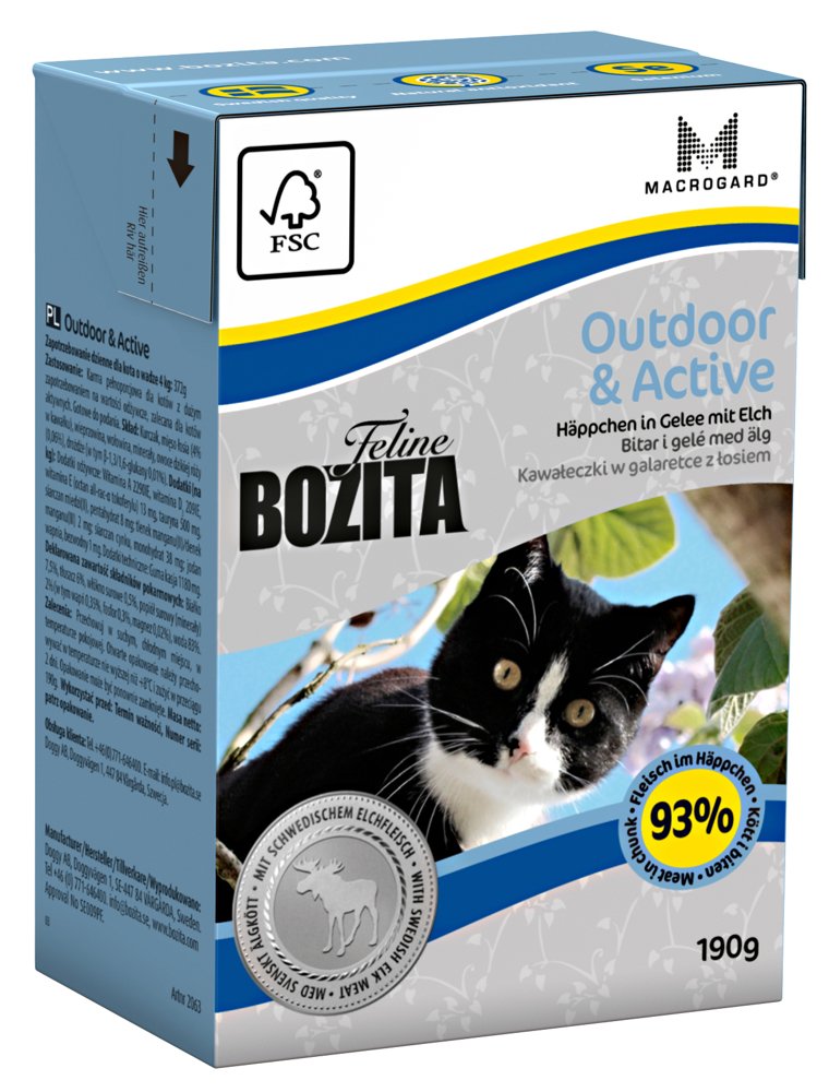 Bozita Feline Outdoor & Active kawałeczki w galaretce jest karmą mokrą dla kotów przebywających na dworze i aktywnych kotów. Dla kotów < 1-rocznych. Karma ta charakteryzuje się wysoką zawartością mięsa (93%), zawiera naturalne witaminy i minerały, ponadto jest łatwo przyswajalna. Wyprodukowano ją z mięsa szwedzkiego łosia i dlatego jest tak smaczna. Mięso łosia jest ponadto nisko alergennym surowcem i z tego powodu karma ta dobrze nadaje się dla kotów o delikatnej skórze lub wrażliwym układzie trawiennym.