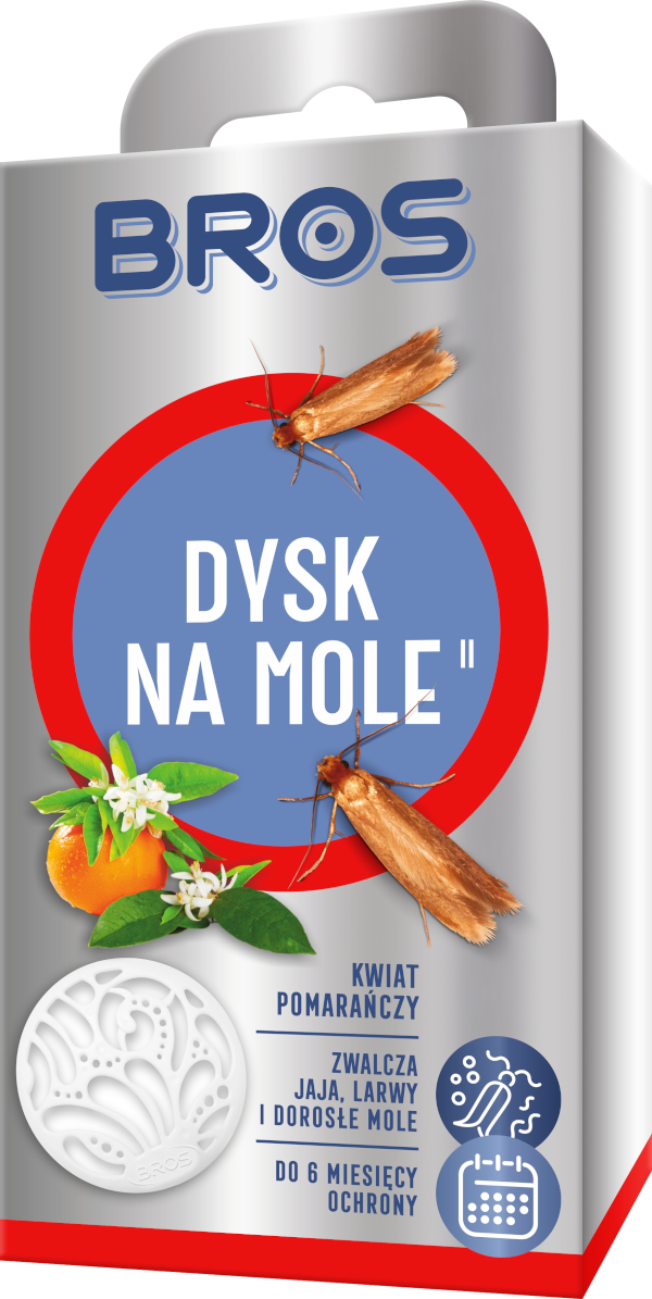 Dysk skutecznie zwalcza mole odzieżowe (osobniki dorosłe, jaja i larwy) w szafach, szufladach i garderobach. Nadaje delikatny zapach i chroni ubrania do 6 miesięcy. Dysk ma ładny wygląd, jest prosty w użyciu. Dysk BROS idealnie sprawdzi się jako ochrona przed molami w szafach, szufladach i garderobach. Jeden dysk zabezpiecza szafę o pojemności 1 m³.
