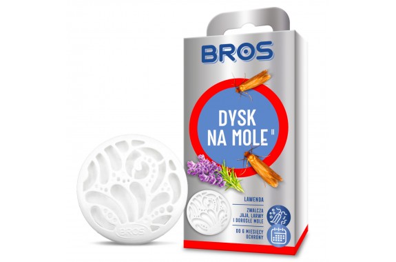 Dysk skutecznie zwalcza mole odzieżowe (osobniki dorosłe, jaja i larwy) w szafach, szufladach i garderobach. Nadaje delikatny zapach i chroni ubrania do 6 miesięcy. Dysk ma ładny wygląd, jest prosty w użyciu. Dysk BROS idealnie sprawdzi się jako ochrona przed molami w szafach, szufladach i garderobach. Jeden dysk zabezpiecza szafę o pojemności 1 m³.