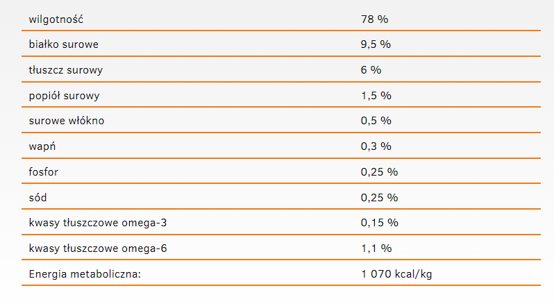 wołowina (70%), mąka grochowa, olej z łososia (1%), lignoceluloza, węglan wapnia.