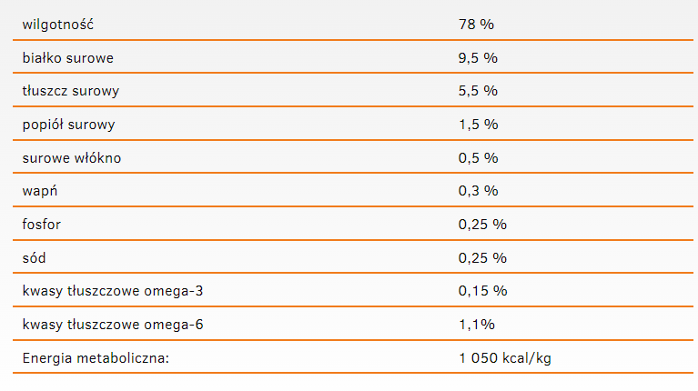 białko surowe 10,9%, tłuszcz surowy 7,4%, popiół surowy 2,6%, włókno surowe 0,4%, wilgotność 78,5%.