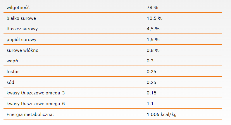 białko surowe 10,8%, tłuszcz surowy 7,2%, popiół surowy 2,7%, włókno surowe 0,4%, wilgotność 78,5%.