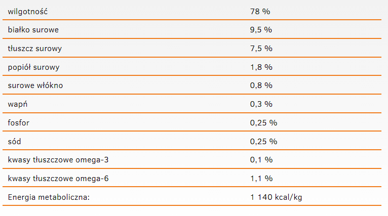 • Ograniczona liczba składników, bez zbóż i glutenu – wysoka przyswajalność