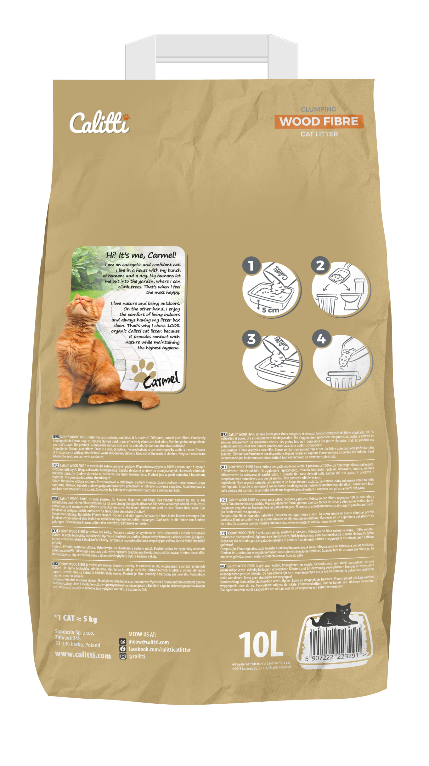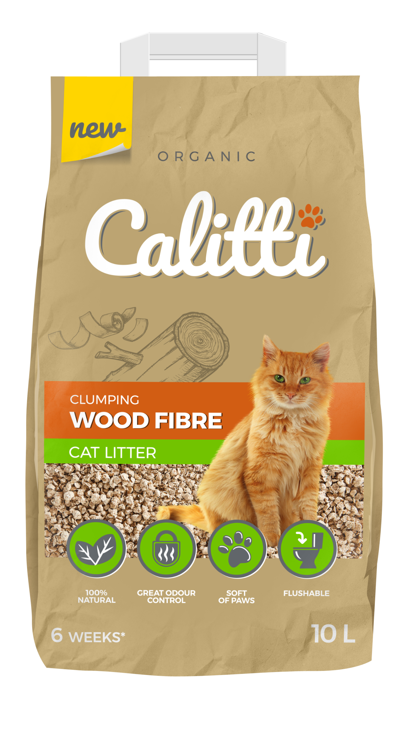 Calitti WOOD FIBRE to żwirek dla kotów, gryzoni i ptaków. Wyprodukowany jest w 100% z naturalnych i czystych włókien roślinnych. Ulega całkowitej biodegradacji. Szybko zbryla się w łatwe do usunięcia bryłki i skutecznie eliminuje brzydkie zapachy. Drobne ziarenka są delikatne dla łapek Twojego kota. Produkt jest w pełni naturalny i bezpieczny zwierząt. Nie posiada dodatków chemicznych.