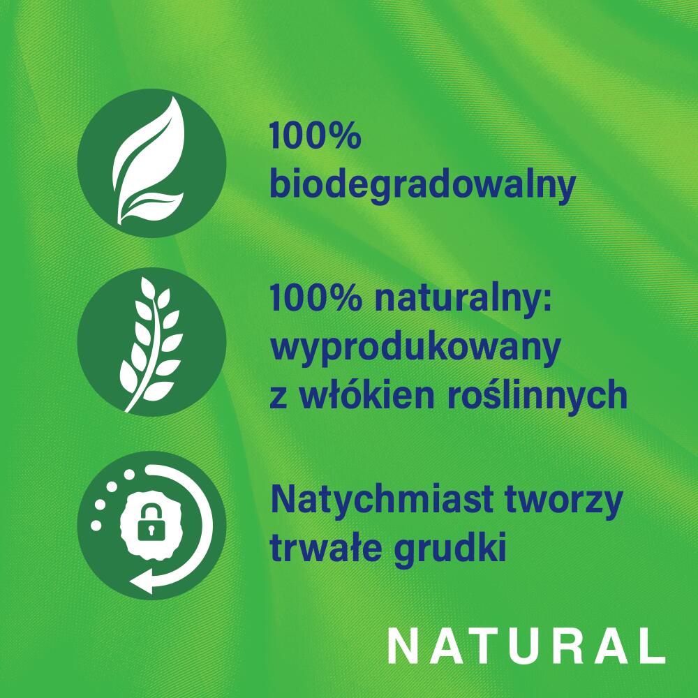 Pomaga zadbać o potrzeby kota i zapewnia mu higieniczną kuwetę. Ten zbrylający się żwirek zawiera 100% naturalnych włókien roślinnych, które ulegają całkowitej biodegradacji. Szybko wiąże nieprzyjemne zapachy i natychmiast tworzy trwałe grudki, które można łatwo usunąć za pomocą łopatki. Wyróżnia go także wyjątkowa struktura – granulki są bardzo delikatne i przyjemne dla kocich łapek.