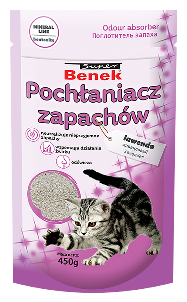 Pochłaniacz na bazie naturalnego mineralnego surowca, wzbogacony kompozycja zapachową o przyjemnym naturalnym zapachu o właściwościach aromaterapeutycznych. Działa kojąco i uspokajająco na zwierzęta. Pochłaniacze zapachów to grupa wyrobów pokrewnych neutralizatorom, spełniająca podobne funkcje tj. poprawa parametrów użytkowych żwirków higienicznych oraz usuwanie zanieczyszczeń pozostawionych przez zwierzęta. Doskonale adsorbują nieprzyjemne zapachy, dbając jednocześnie o szeroko pojętą higienę w kuwecie i wokół niej.