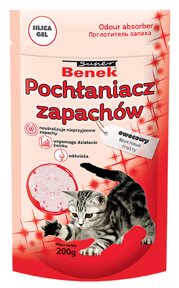Pochłaniacz Owocowy to produkt oparty na bazie żelu krzemionkowego, całkowicie neutralizuje nieprzyjemne zapachy pojawiające się w kuwecie. Charakteryzuje się wysoką zdolnością wchłaniania powstającej wilgoci. Pochłaniacze zapachów to grupa wyrobów pokrewnych neutralizatorom, spełniająca podobne funkcje tj. poprawa parametrów użytkowych żwirków higienicznych oraz usuwanie zanieczyszczeń pozostawionych przez zwierzęta. Doskonale adsorbują nieprzyjemne zapachy, dbając jednocześnie o szeroko pojętą higienę w kuwecie i wokół niej.