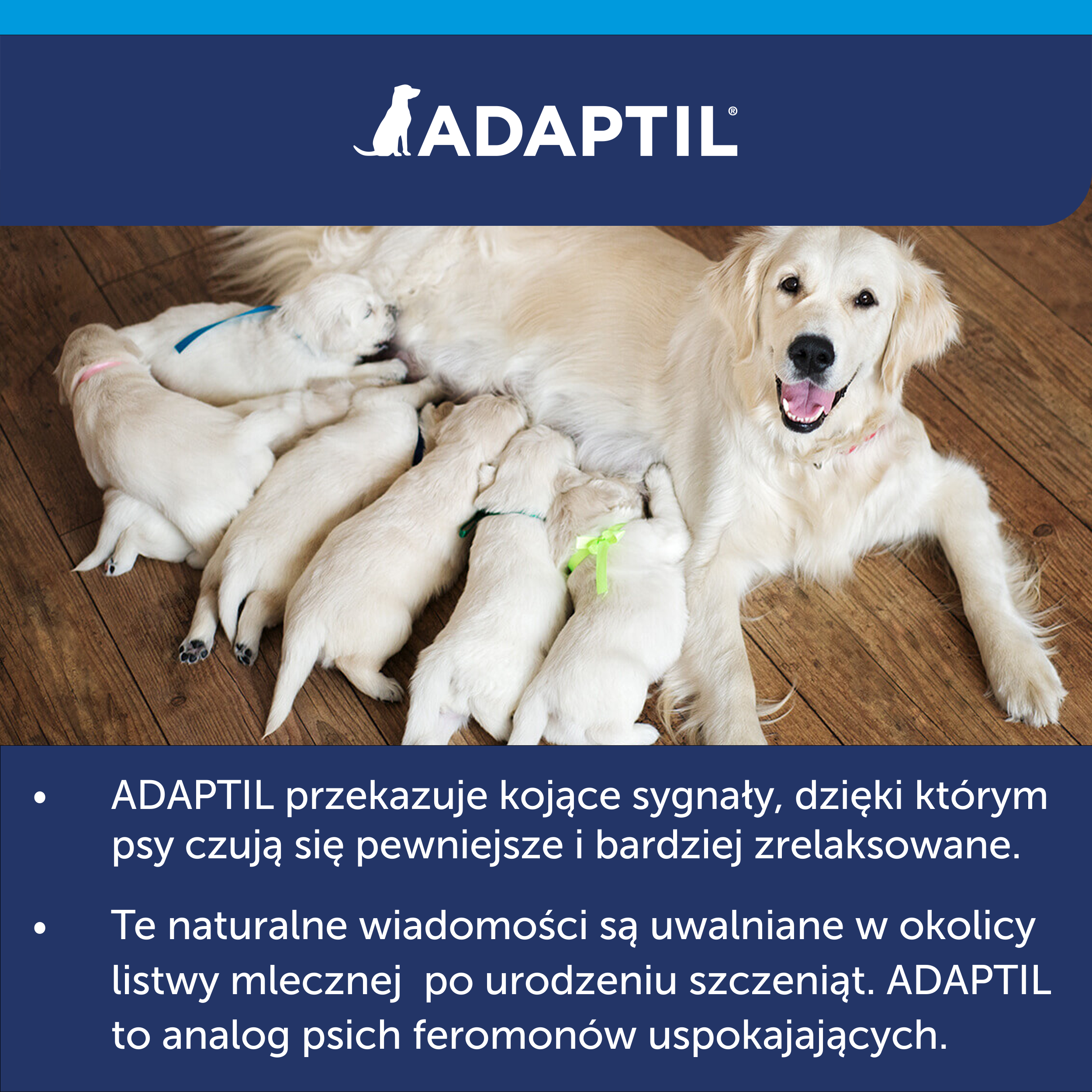 Wkład do dyfuzora Adapil. Feromony uspokajające są naturalnie uwalniane przez karmiące suki. Feromony te uspokajają szczenięta, poprzez zapewnienie im poczucia bezpieczeństwa i dodanie otuchy w sytuacji nowych doświadczeń i nieznanego środowiska.