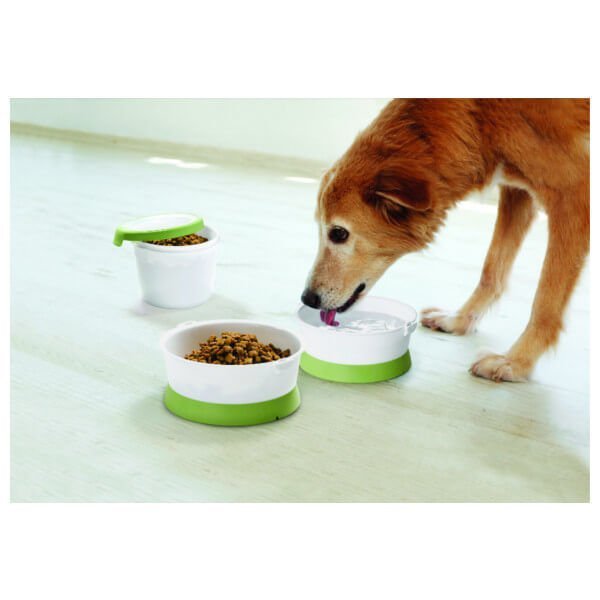 Podręczny zestaw Curver przeznaczony do przenoszenia i serwowania karmy Twojemu psu lub kotu w czasie podróży. Zestaw składa się z plastikowego pojemnika na karmę oraz dwóch plastikowych misek, idealnych do podawania pożywienia lub wody podczas wycieczki. Złożony zestaw tworzy poręczną i lekką tubę z dołączonym uchwytem ułatwiającym przenoszenie.