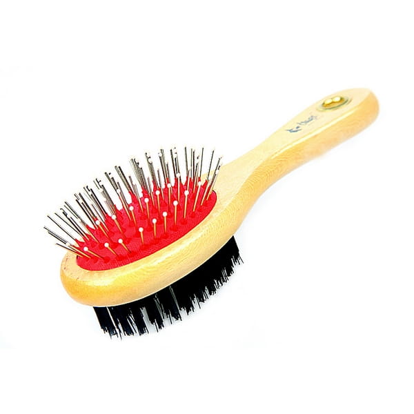 Szczotka została wykonana z lakierowanego drewna – wyprofilowana rączka jest wygodna i dobrze leży w dłoni. Metalowe igły z kulkami świetnie sprawdzą się do rozczesywania sierści, a z kolei druga strona z włosia PCV idealna jest do wyczesywania podszerstka.