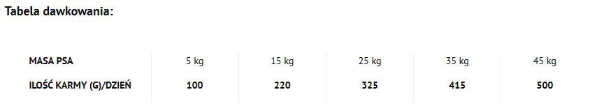 | Ilość karmy(g)/dzień | 100 | 220 | 325 | 415 | 500 |