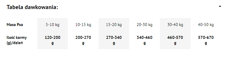 Dostosować ilość karmy do wagi i aktywności psa, zapewniając stały dostęp do świeżej wody.