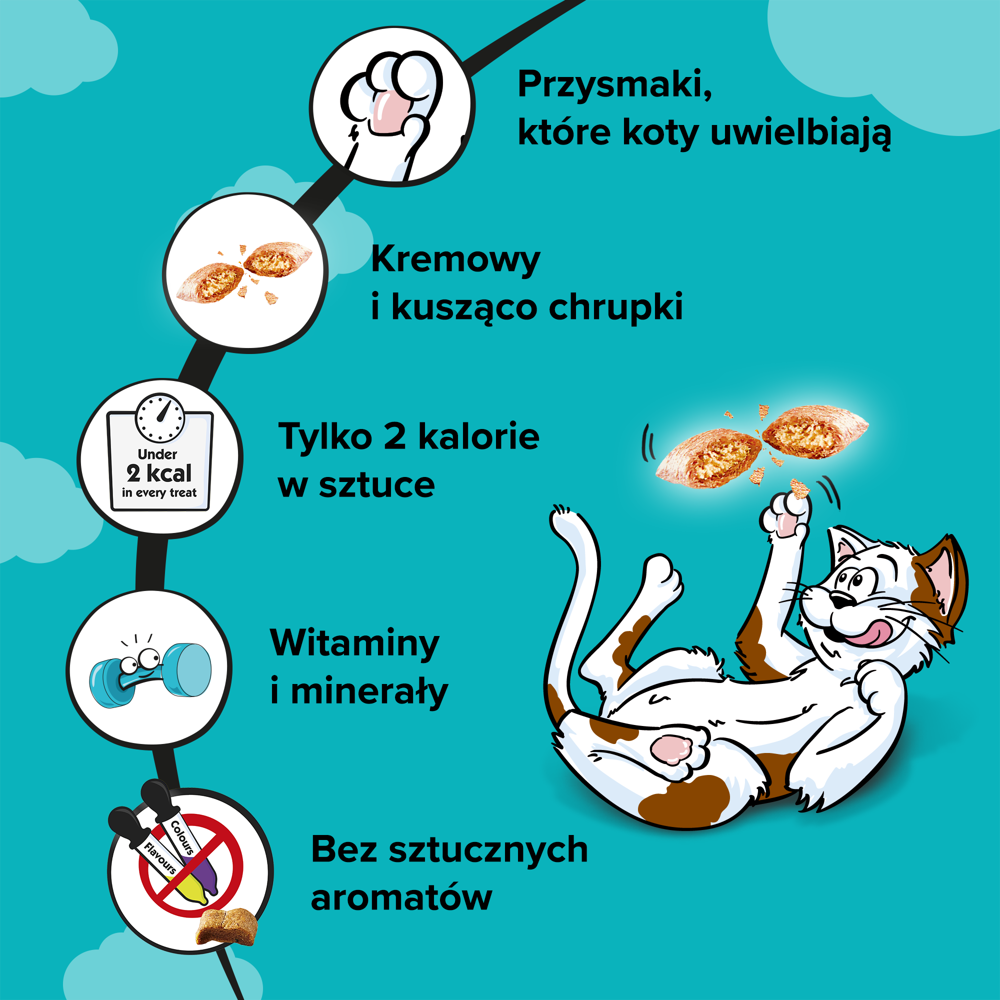 To pokarm uzupełniający przeznaczony jest dla kotów powyżej 8 tygodnia życia, w formie pysznych chrupiących pasztecików wypełnionych miękkim nadzieniem z łososia. Ich skład wzbogacony o mikro i makro minerały pomoże utrzymać Twojego kota w dobrej kondycji.