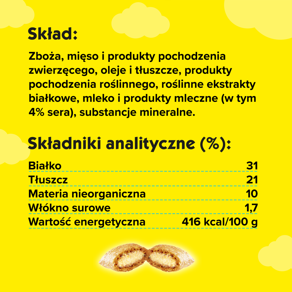 To pokarm uzupełniający dla kotów powyżej 8 tygodnia życia, o smaku serowym. Ich pyszna chrupiąco-miękka konsystencja zachwyci Twojego pupila.