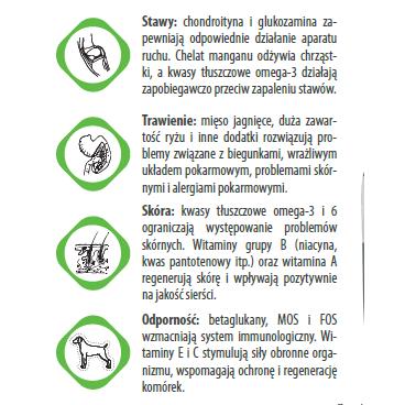 Sucha kompletna karma dla psów od 4 miesiąca życia wszystkich ras, o smaku jagnięciny z ryżem. Stosowana w sytuacjach wrażliwego układu pokarmowego, alergii lub problemów skórnych. Opakowanie 15kg.