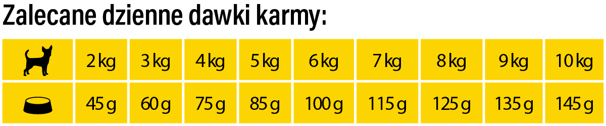 | Ilość karmy | 45 G | 60 G | 75 G | 85 G | 100 G | 115 G | 125 G | 135 G | 145 G |