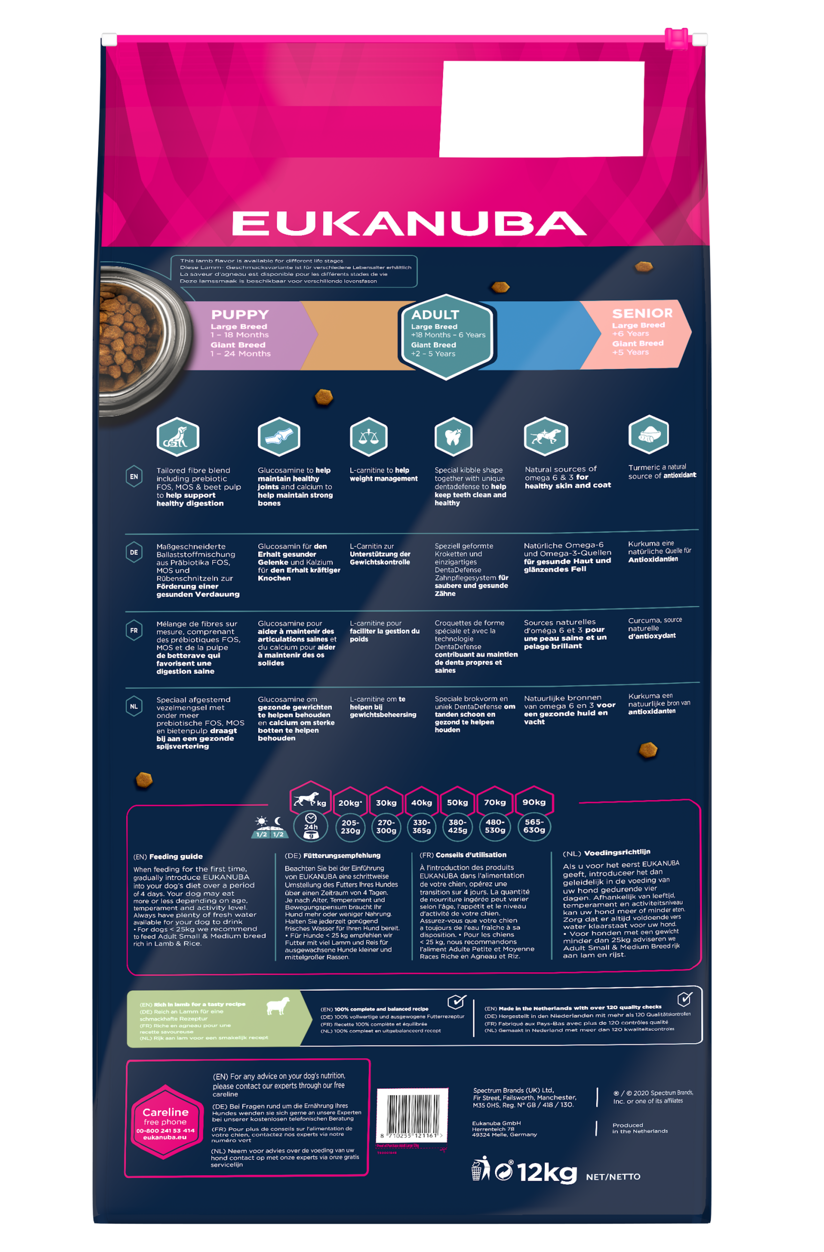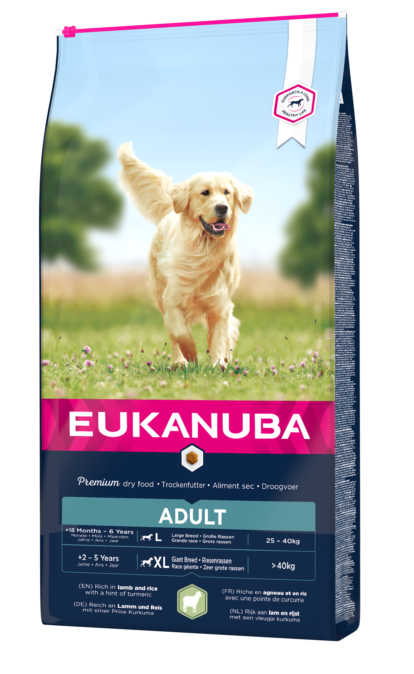 EUKANUBA sucha karma dla psów dorosłych dużych i olbrzymich ras. Jest idealna dla ras, takich jak owczarek niemiecki, labrador, rottweiler oraz golden retriever. Możesz sprawić, by pies cieszył się pełnią życia zapewniając mu wysokiej jakości pożywienie zaspokajające wszystkie jego potrzeby. EUKANUBA, sucha karma dla psów dorosłych dużych i olbrzymich ras, jest bogata w jagnięcinę i ryż. Jest szczególnie odpowiednia dla psów o wrażliwych żołądkach. Specjalnie dostosowana mieszanka błonnika z prebiotykami i pulpą buraczaną sprzyja zdrowemu trawieniu. Karma EUKANUBA zawiera również naturalne źródła glukozaminy i wapnia, pomagające utrzymać zdrowe stawy i mocne kości, dzięki czemu psy mogą cieszyć się aktywnym życiem. Kurczak, obok jagnięciny, jest dodatkowym źródłem białka sprzyjającym rozwojowi silnych i nieotłuszczonych mięśni. Sucha karma zawiera także L-karnitynę, wspomagającą redukcję tkanki tłuszczowej w organizmie. Twój pies może utrzymać optymalną wagę, a jego stawy są mniej obciążone. Wykorzystane w EUKANUBA naturalne źródła kwasów tłuszczowych Omega 6 i Omega 3, wspierają zdrową skórę i lśniącą sierść oraz pomagają ograniczyć linienie. Nasza receptura została również wzbogacona kurkumą, naturalnym źródłem przeciwutleniaczy, wpływającą pozytywnie na układ odpornościowy Twojego psa.