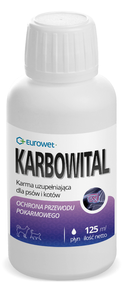 KARBOWITAL karma uzupełniająca dla psów i kotów, wpływa korzystnie na przewód pokarmowy przy zaburzeniach żołądkowo-jelitowych. Koloidalny roztwór węgla chroni błonę śluzową przewodu pokarmowego przed drażniącymi czynnikami, absorbuje szkodliwe substancje. Wspomaga prawidłowe funkcjonowanie jelit.