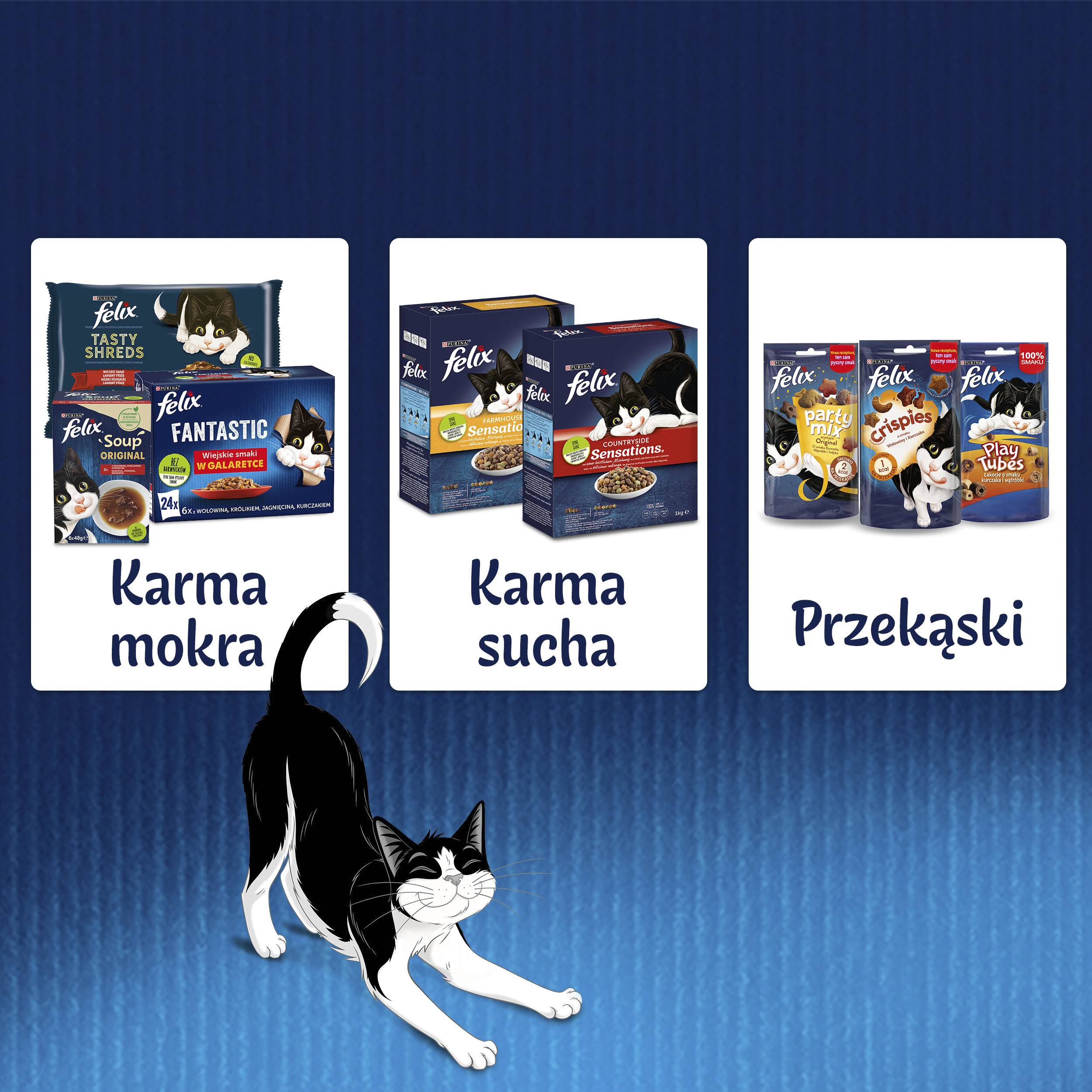 Felix Fantastic to pełnoporcjowa karma dla dorosłych kotów, odpowiednia także dla kotów wysterylizowanych. Każdy posiłek zawiera delikatne, soczyste kąski w galaretce, które wyglądają i pachną jak domowy posiłek, a ich smak zachwyci nawet najbardziej wybredne koty.