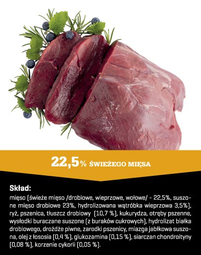 - Mięso (świeże mięso /drobiowe, wieprzowe, wołowe/ – 22,5%, suszone mięso drobiowe 23%, hydrolizowana wątróbka wieprzowa 3,5%)