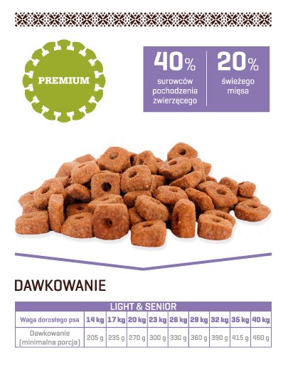 Fitmin dog For Life Light and Senior to tradycyjna karma jakości premium, która zaspokoi zarówno gusta Twojego psa, a także jego potrzebę zbilansowanej diety w starszym wieku. Jest idealna również dla psów z nadwagą. U psów wszystkich wielkości, mogą pojawić się sytuacje, w których trzeba będzie wybrać karmę z najwyższej jakości błonnikiem dla prawidłowej perystaltyki jelit oraz niższą zawartością energetyczną. Co więcej, na pewno będziesz zadowolony z tego, że za rozsądną cenę możesz podarować swojemu psu wspaniały smak i jakość karmy.