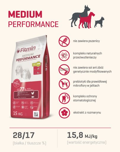 W karmie FITMIN Medium Performance 77% stanowią składniki pochodzenia zwierzęcego, uzupełnione o cenne substancje roślinne. Zawartość świeżego mięsa wynosi aż 50%, co pozwala na rozwój silnych mięśni. Przemyślana mieszanka witamin i minerałów wzmacnia odporność i poprawia kondycję. Odpowiednia ilość błonnika wspomaga prawidłową pracę jelit. Ekstrakt z rozmarynu ma pozytywny wpływ na przebieg procesów w układzie trawiennym. Kompleks ochrony stomatologicznej dba o mocne i zdrowe zęby Twojego psa. Ponadto karma FITMIN Medium Performance nie zawiera soi, zbóż genetycznie modyfikowanych oraz pszenicy, która mogłaby wywoływać reakcje alergiczne.
