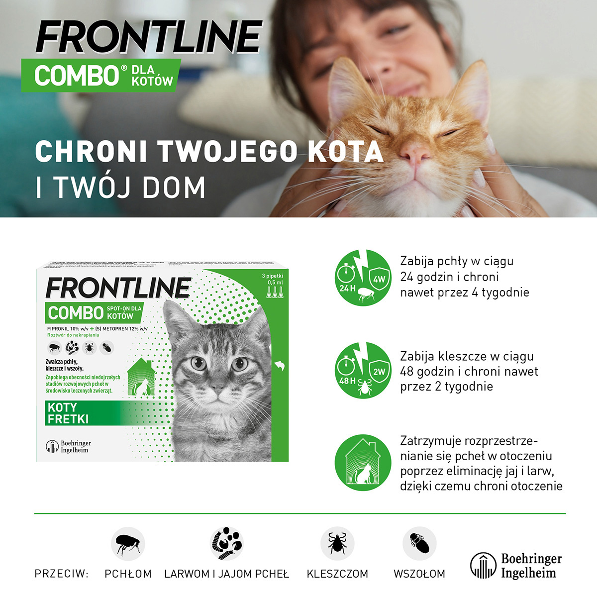 FRONTLINE COMBO dla kotów powyżej 8 tygodni i 1kg masy ciała, to szybkodziałający, długotrwały i wodoodporny produkt leczniczy do zwalczania pcheł i kleszczy. Jedna łatwa aplikacja zapewnia miesięczną ochronę.