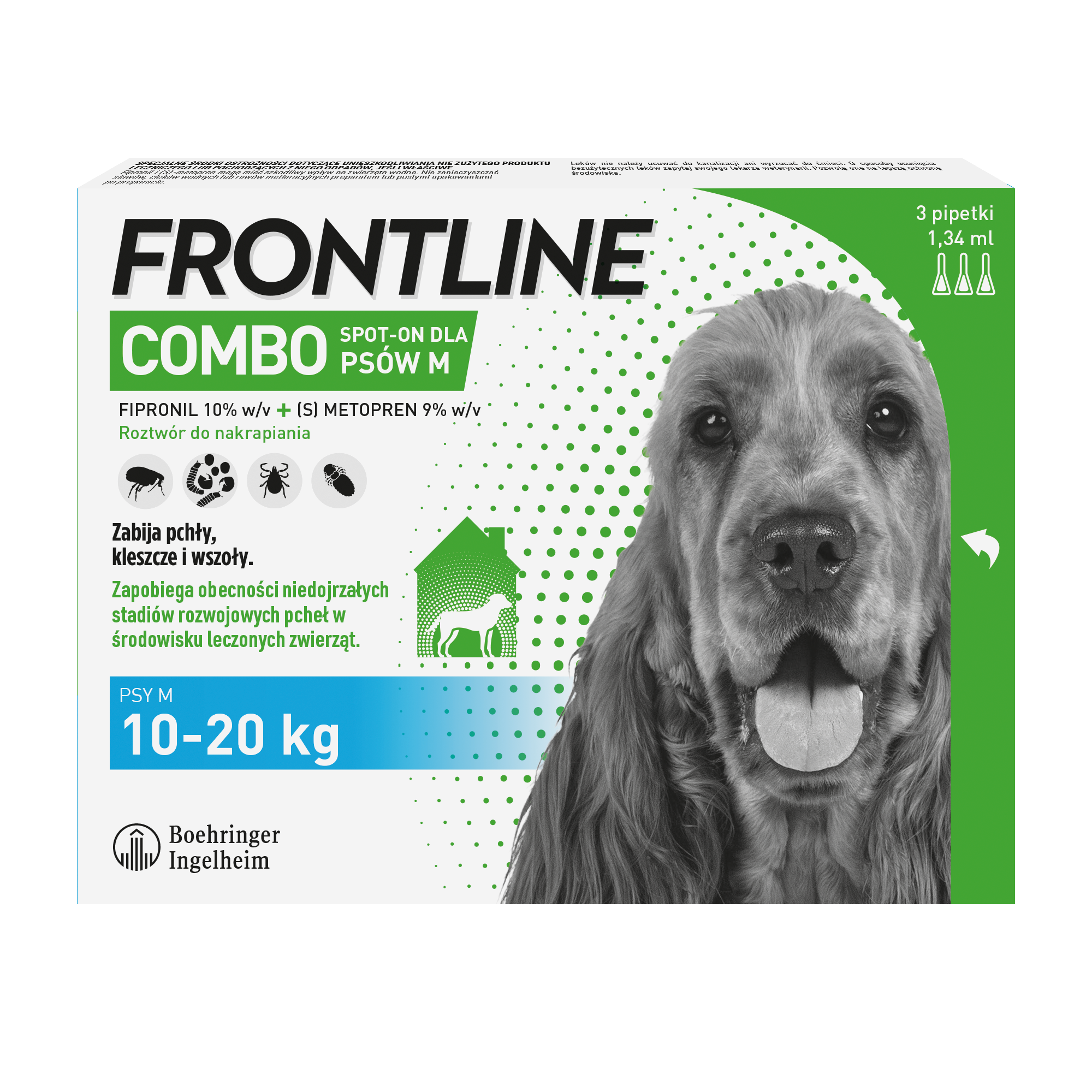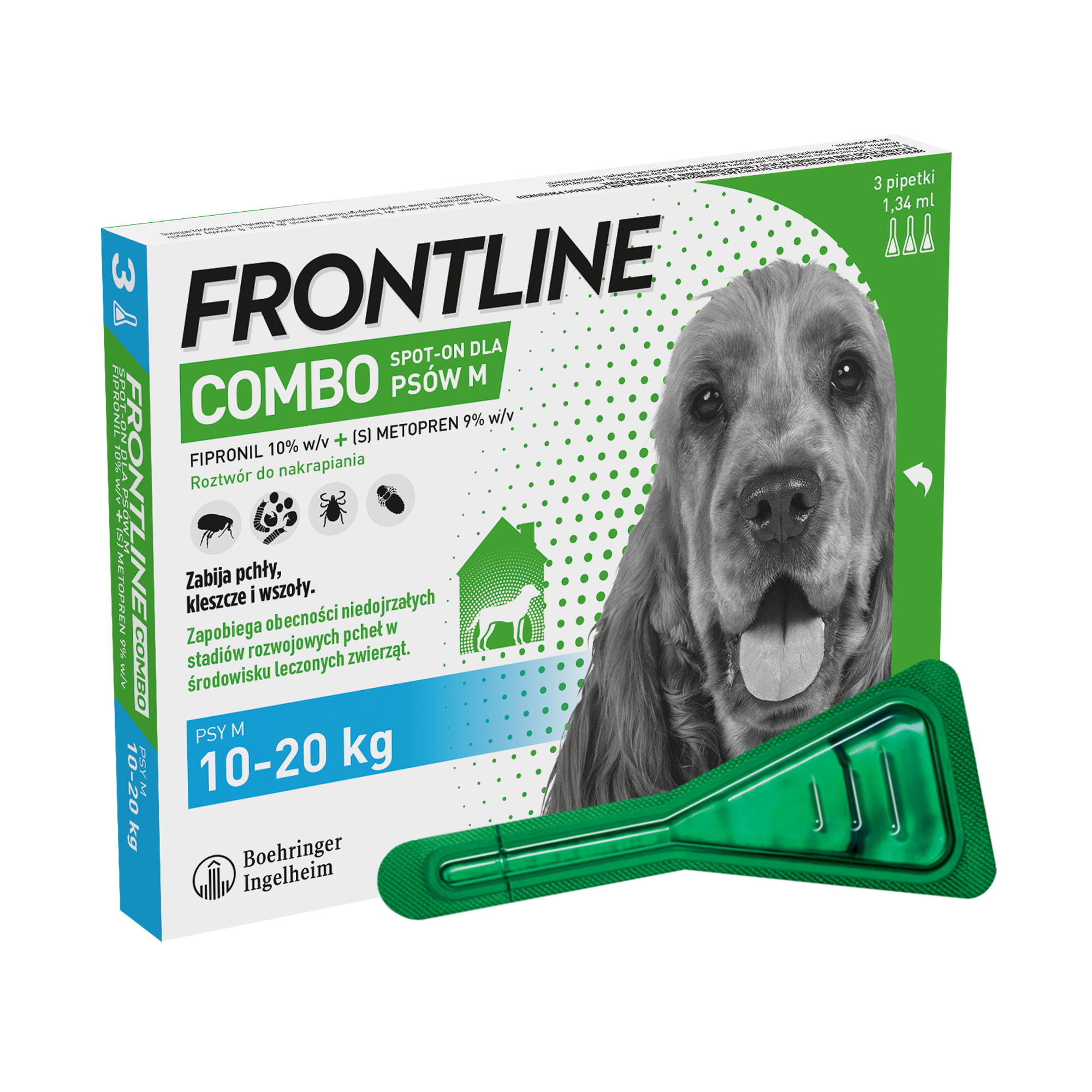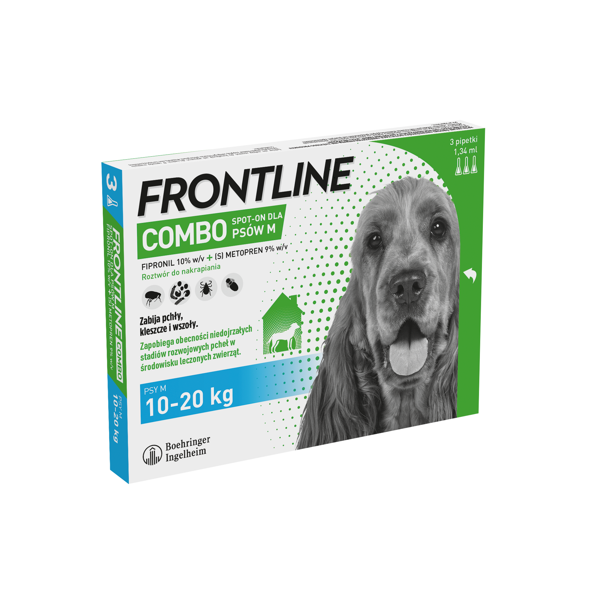 FRONTLINE COMBO dla psów powyżej 8 tygodni, o masie ciała 10-20 kilogramów, to szybkodziałający, długotrwały i wodoodporny produkt leczniczy do zwalczania pcheł i kleszczy. Jedna łatwa aplikacja zapewnia miesięczną ochronę.