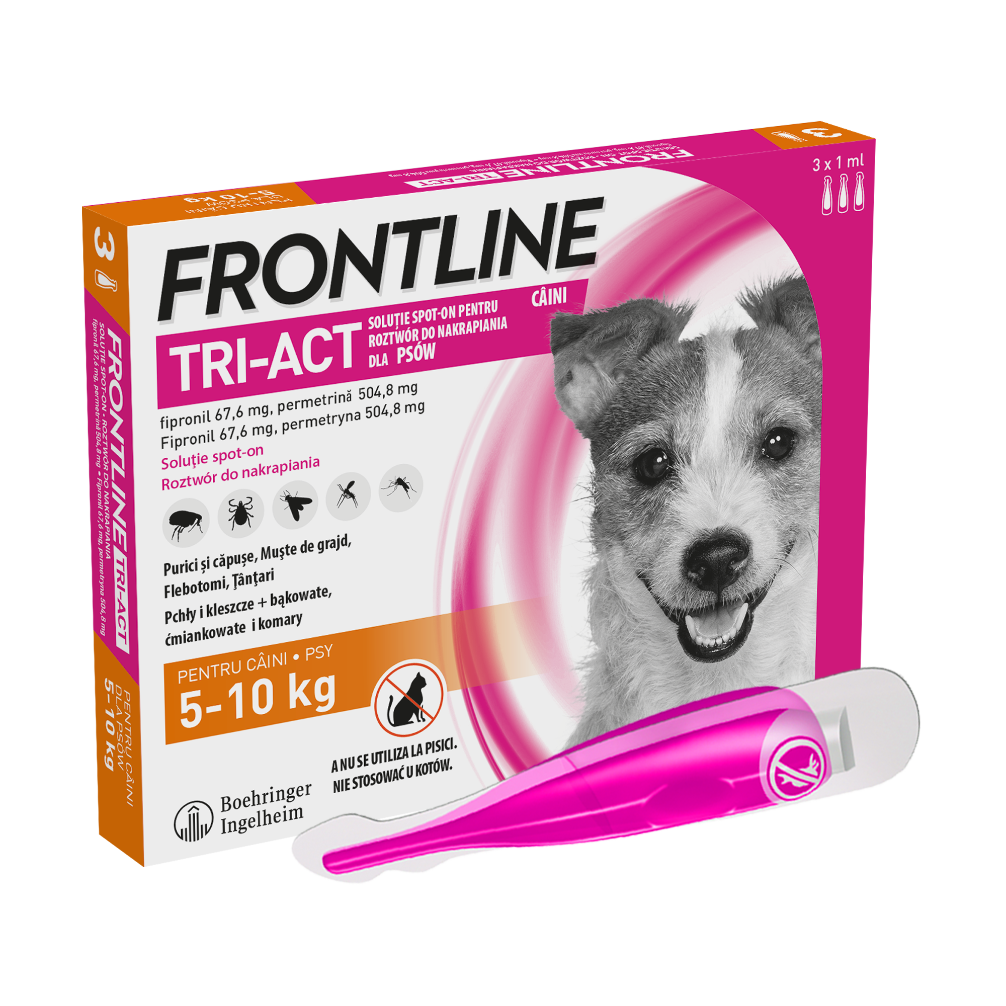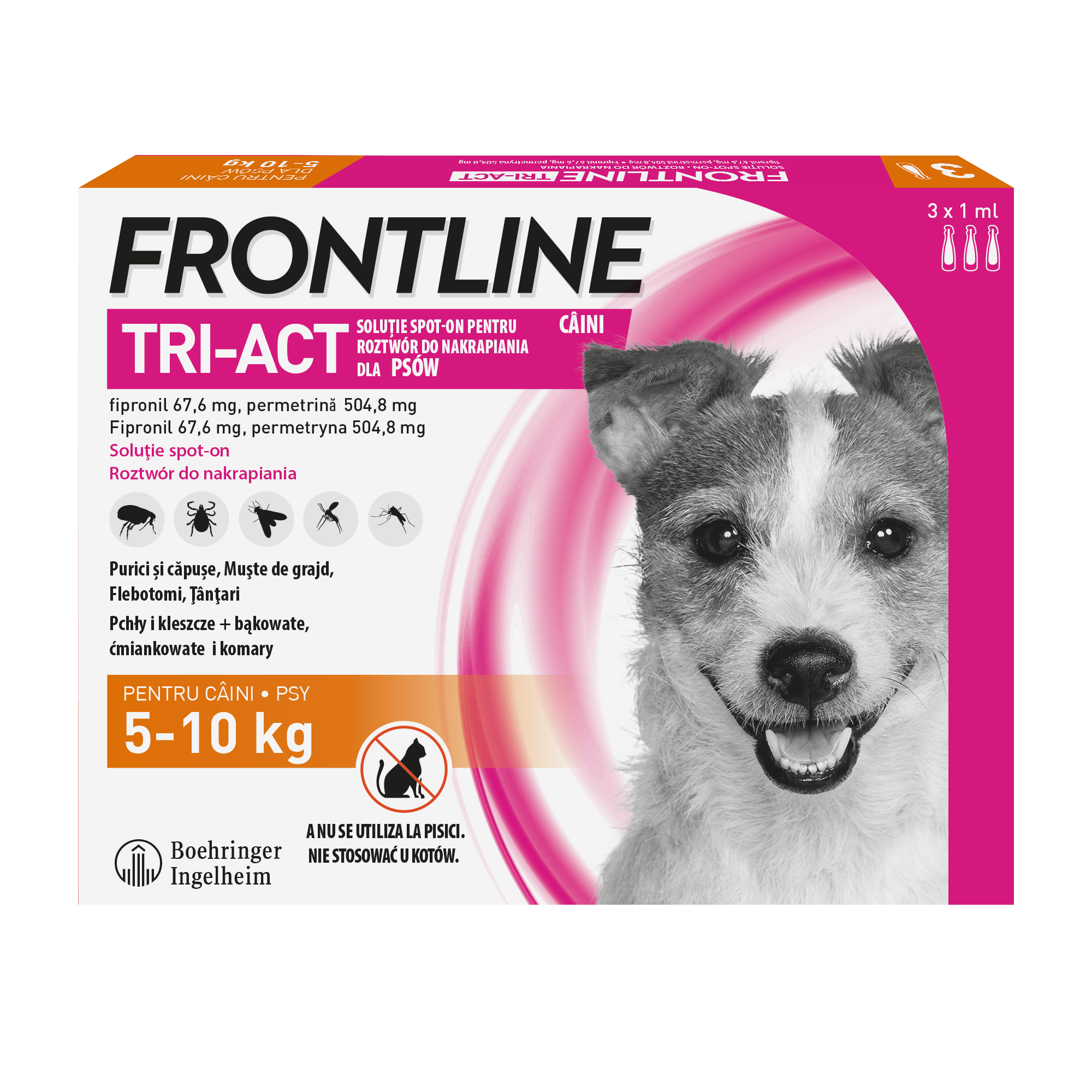 FRONTLINE Tri-Act dla psów powyżej 8 tygodnia życia o wadze 5-10 kg. Zapewnia ultraszybką ochronę, w wyjątkowej formule 3 w 1, zabija pchły i kleszcze i chroni przed ponowną inwazją przez okres pełnego miesiąca. Wodoodporny – działa nawet wtedy, gdy zwierzę zamoknie.