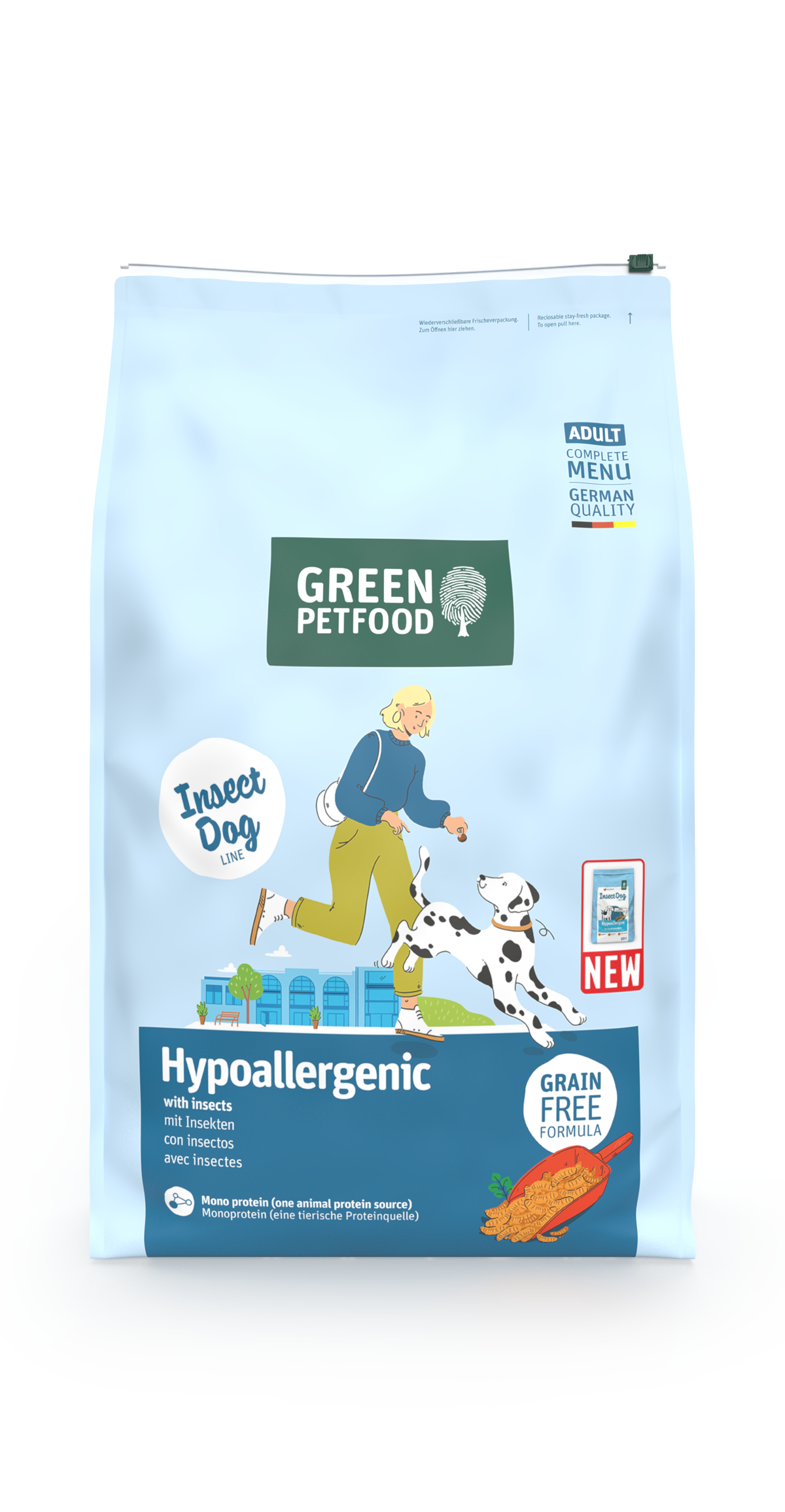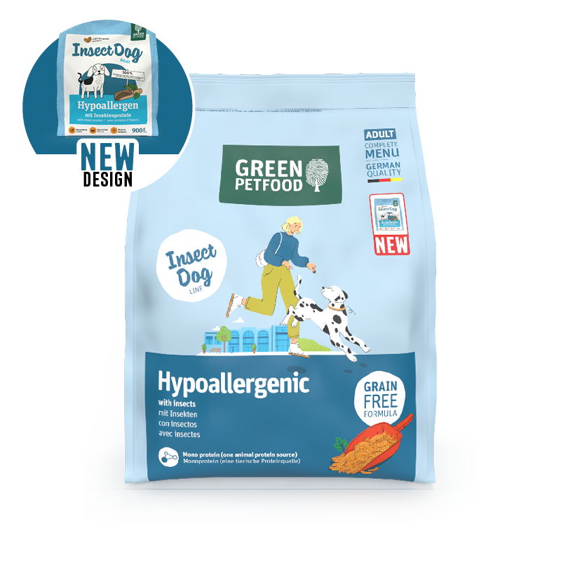 Green Petfood Hypoallergenic with Insects to hipoalergiczna karma dla psów, stworzona z myślą o zwierzętach z nietolerancjami pokarmowymi lub alergiami. Zawiera owady jako monoproteinę zwierzęcą, co jest rzadko wykorzystywanym źródłem białka, idealnym dla psów cierpiących na alergie pokarmowe. Bezzbożowa receptura została wzbogacona o cenne kwasy tłuszczowe, witaminy, cynk i miedź, które wspomagają zdrową skórę i lśniącą sierść.