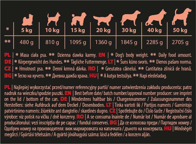 Wartości w tabeli są orientacyjne, dostosuj porcję w zależności od wieku, kondycji i poziomu aktywności psa.