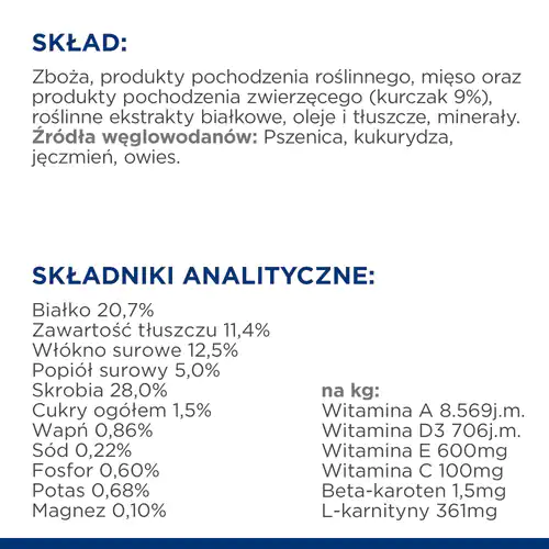 - Mięso i składniki pochodzenia zwierzęcego (kurczak 9%)