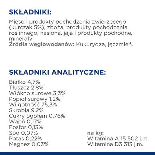 - Mięso i składniki pochodzenia zwierzęcego (kurczak 5%)